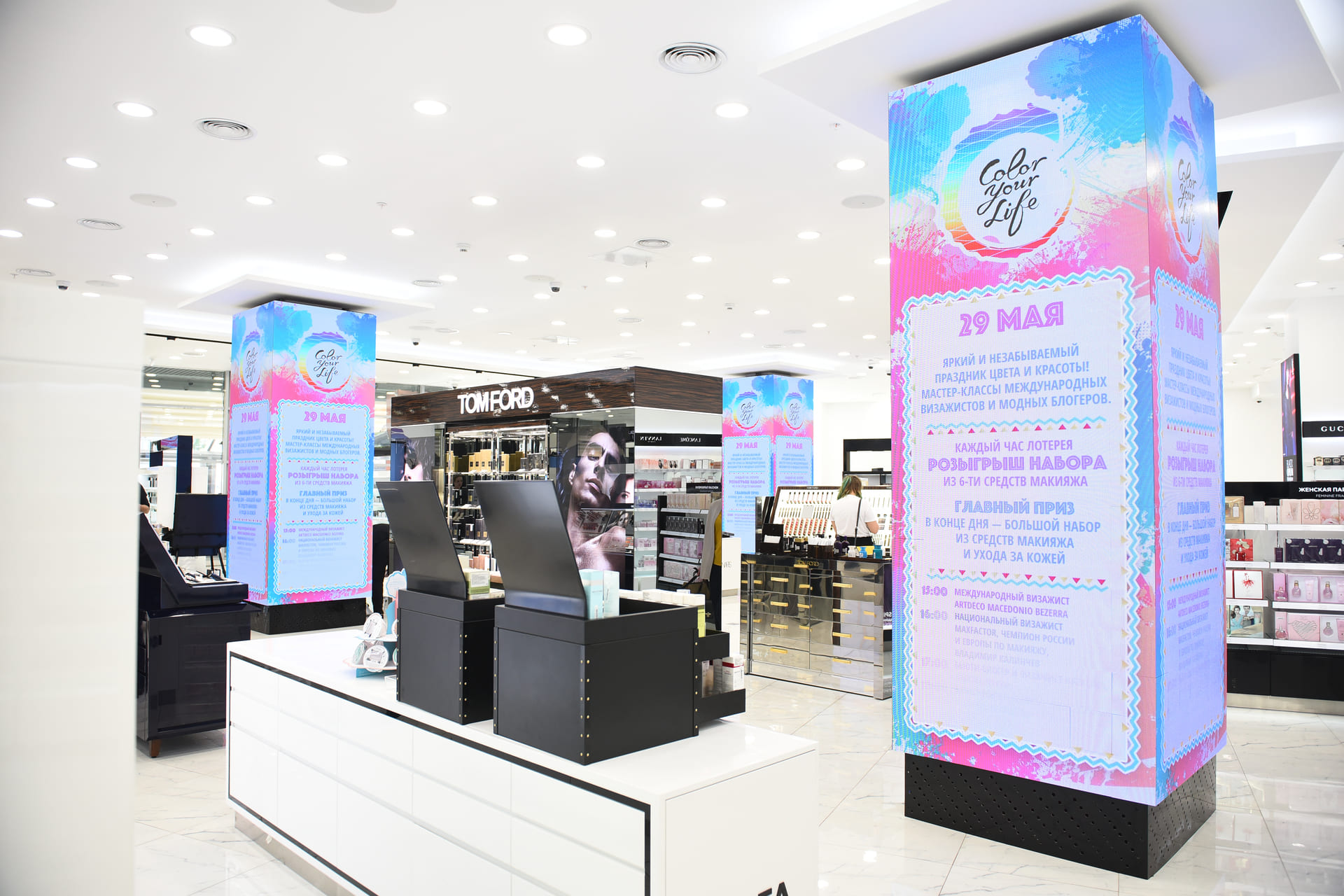 Для продвижения средств макияжа заданных торговых марок в сети Л’Этуаль мы сформировали идею фестиваля Color Your Life, «Добавь ярких красок в свою жизнь». В ее основе множество разнообразных мероприятий. Ключевыми должны были стать мастер-классы по макияжу от известных бьюти-блогеров и представителей производителей косметики; помимо них в концепцию входили презентации от брендов, розыгрыши подарков и другие активности.